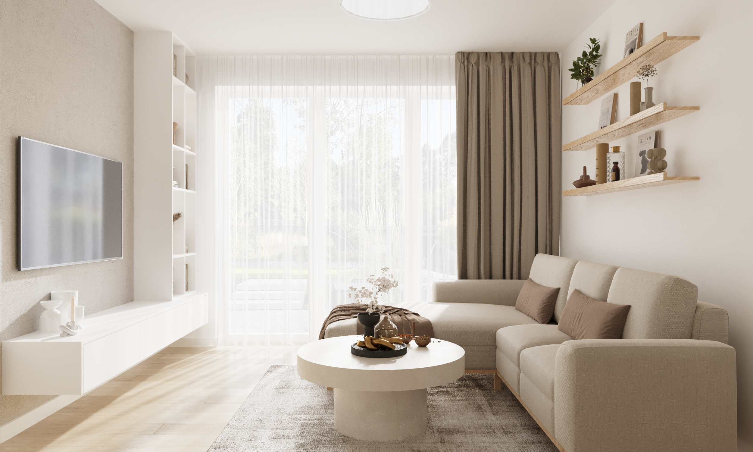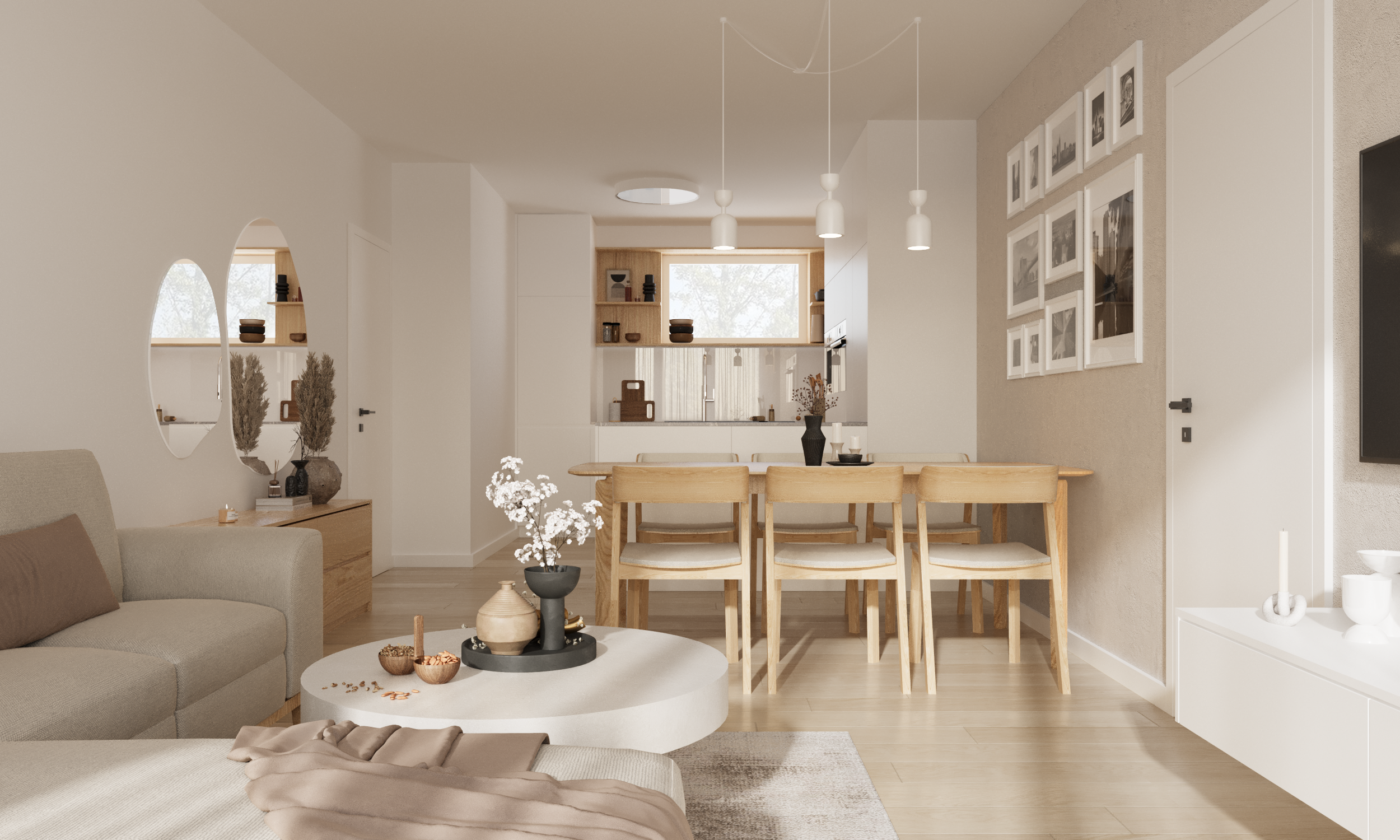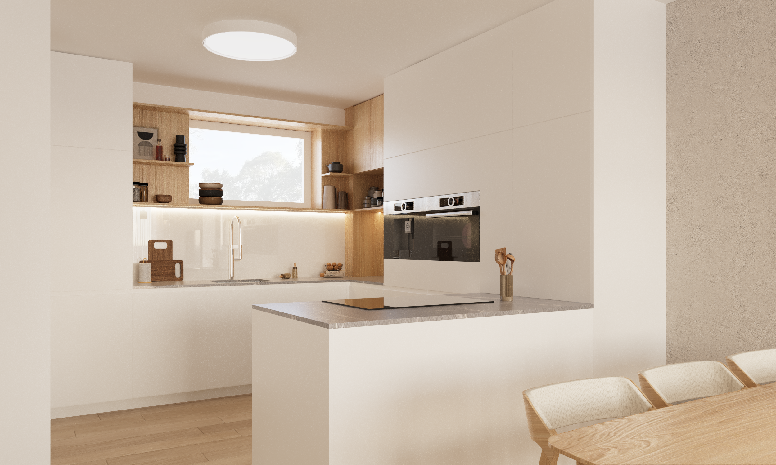 Das Ergebnis ist ein klar strukturiertes, minimalistisches Interieur, das sowohl funktional als auch ästhetisch überzeugt. Die helle Farbpalette – vor allem Weiß- und Beigetöne – lässt den Raum optisch größer wirken und verhindert eine überladene Atmosphäre. Ergänzt wird das Design durch natürliche Eichenelemente, die Wärme, Gemütlichkeit und eine wohnliche Stimmung verleihen. Alle Bereiche – Wohn-, Küchen- und Essbereich – gehen fließend ineinander über und schaffen ein harmonisches Gesamtbild.
