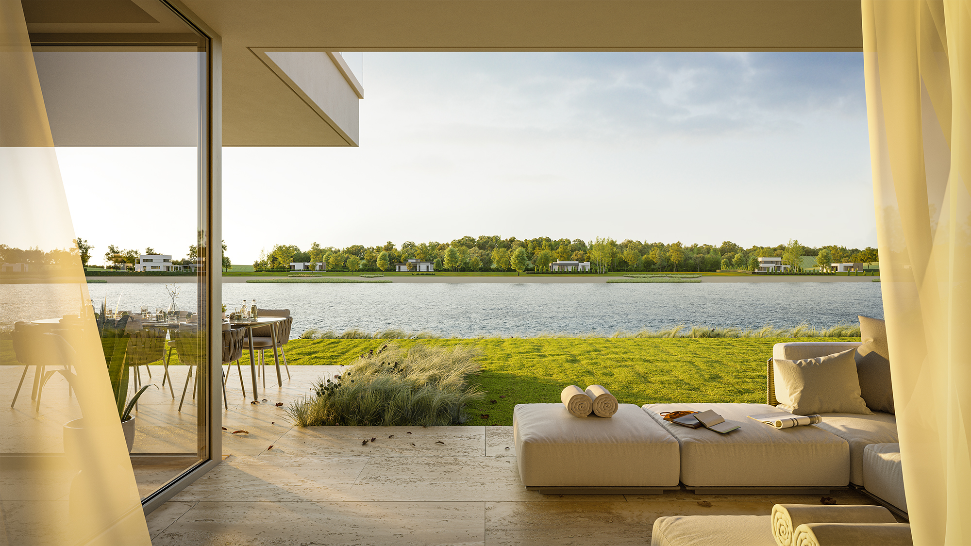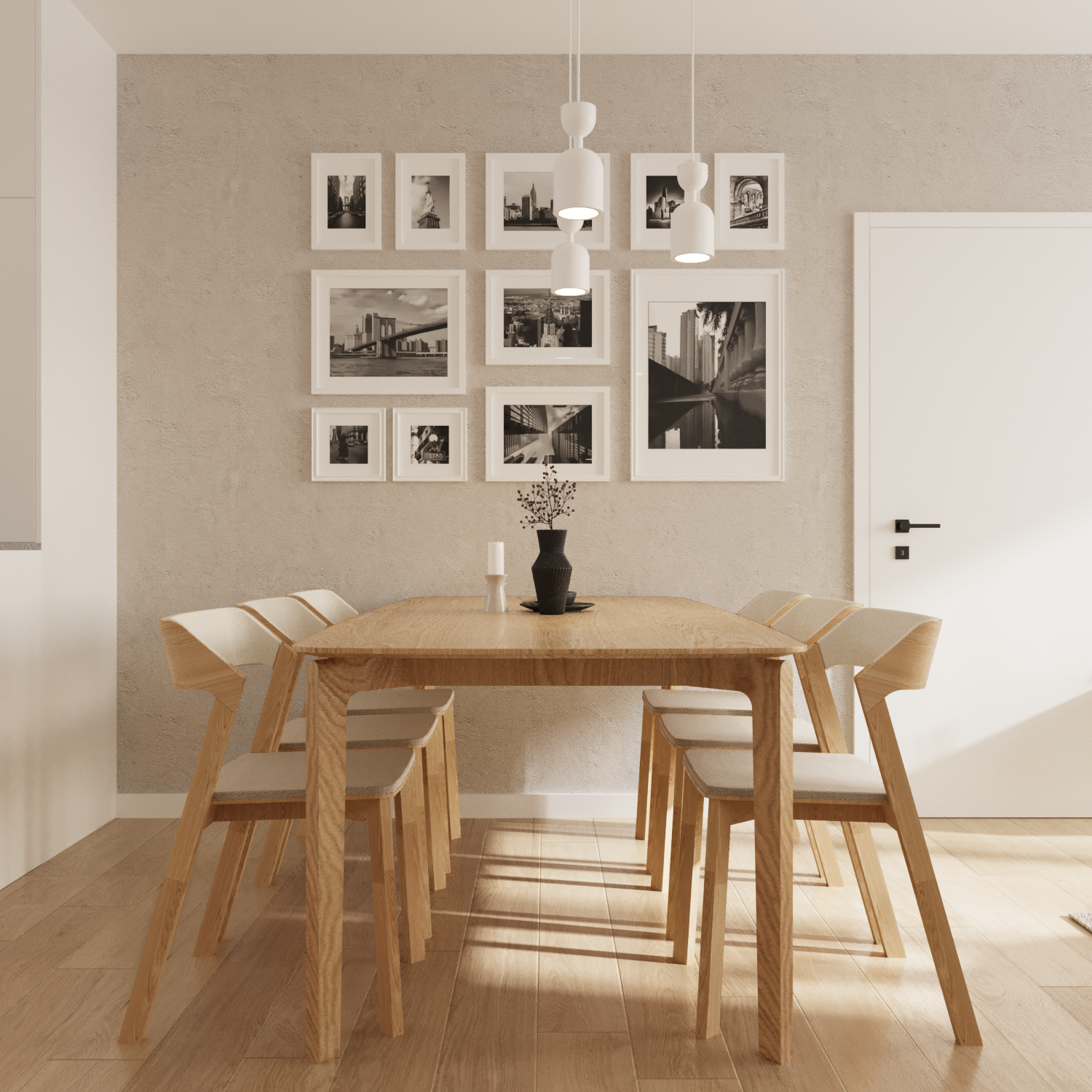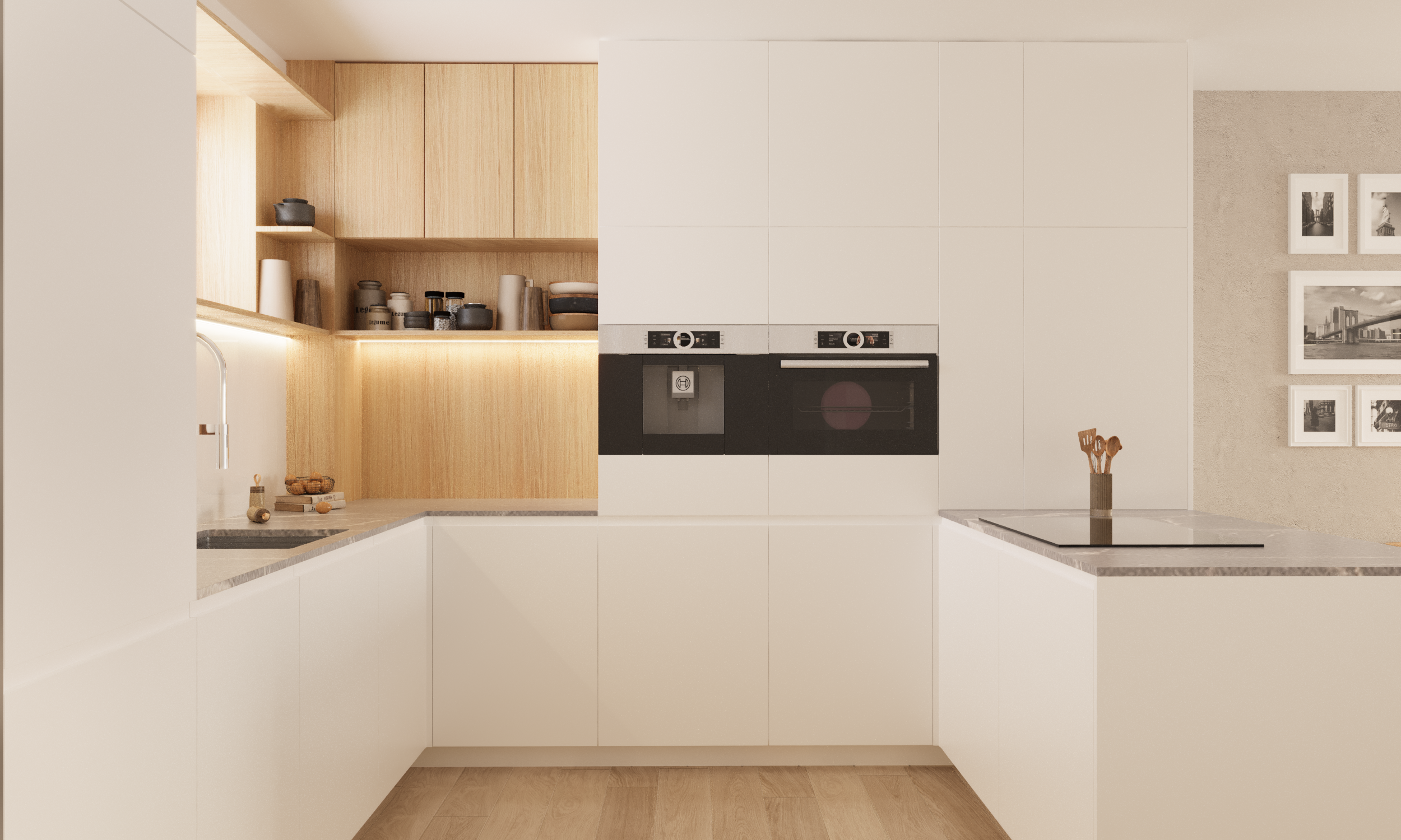 Das Ergebnis ist ein klar strukturiertes, minimalistisches Interieur, das sowohl funktional als auch ästhetisch überzeugt. Die helle Farbpalette – vor allem Weiß- und Beigetöne – lässt den Raum optisch größer wirken und verhindert eine überladene Atmosphäre. Ergänzt wird das Design durch natürliche Eichenelemente, die Wärme, Gemütlichkeit und eine wohnliche Stimmung verleihen. Alle Bereiche – Wohn-, Küchen- und Essbereich – gehen fließend ineinander über und schaffen ein harmonisches Gesamtbild.
