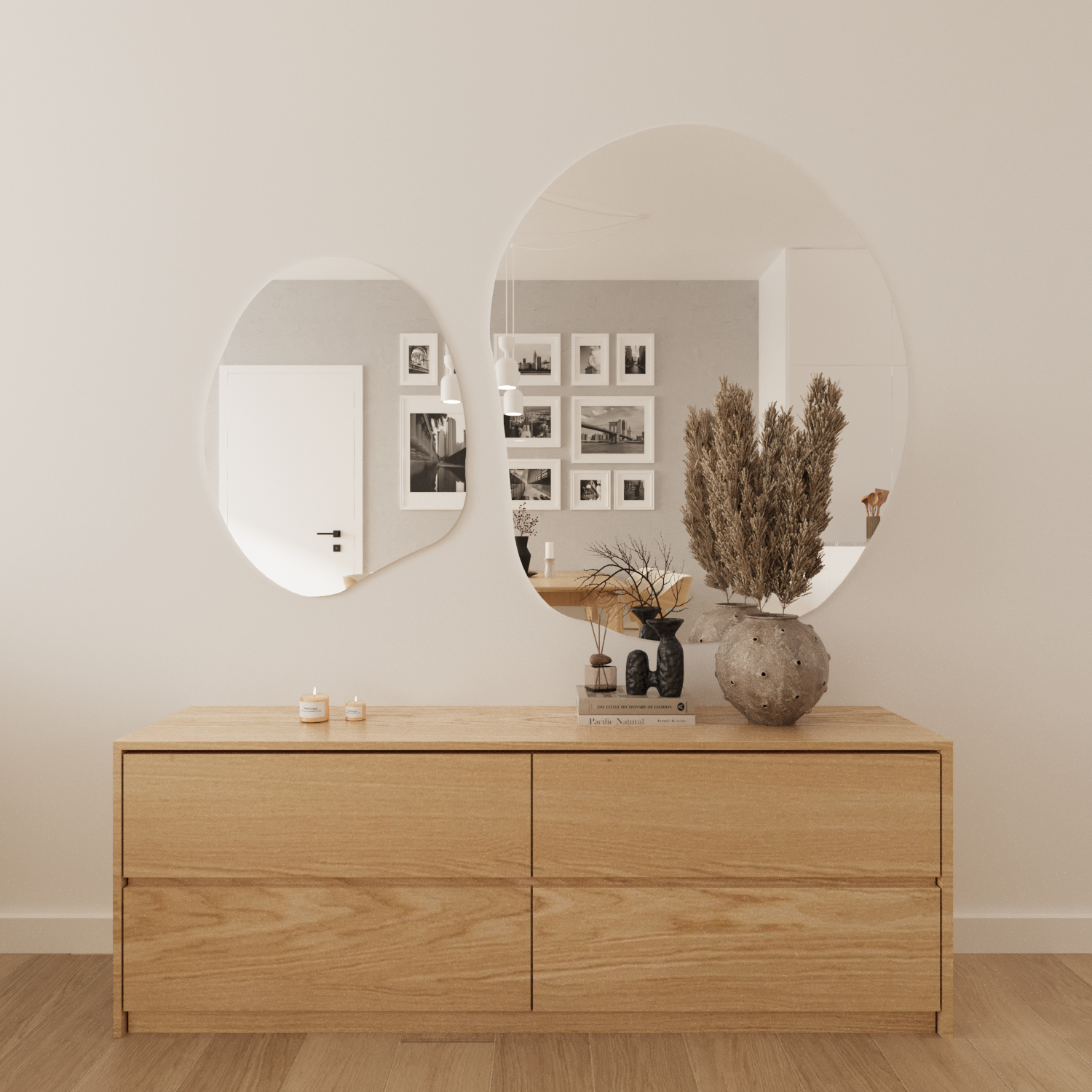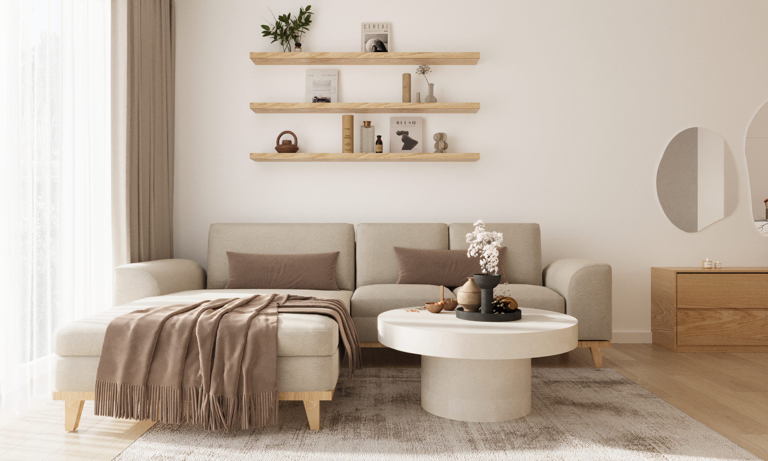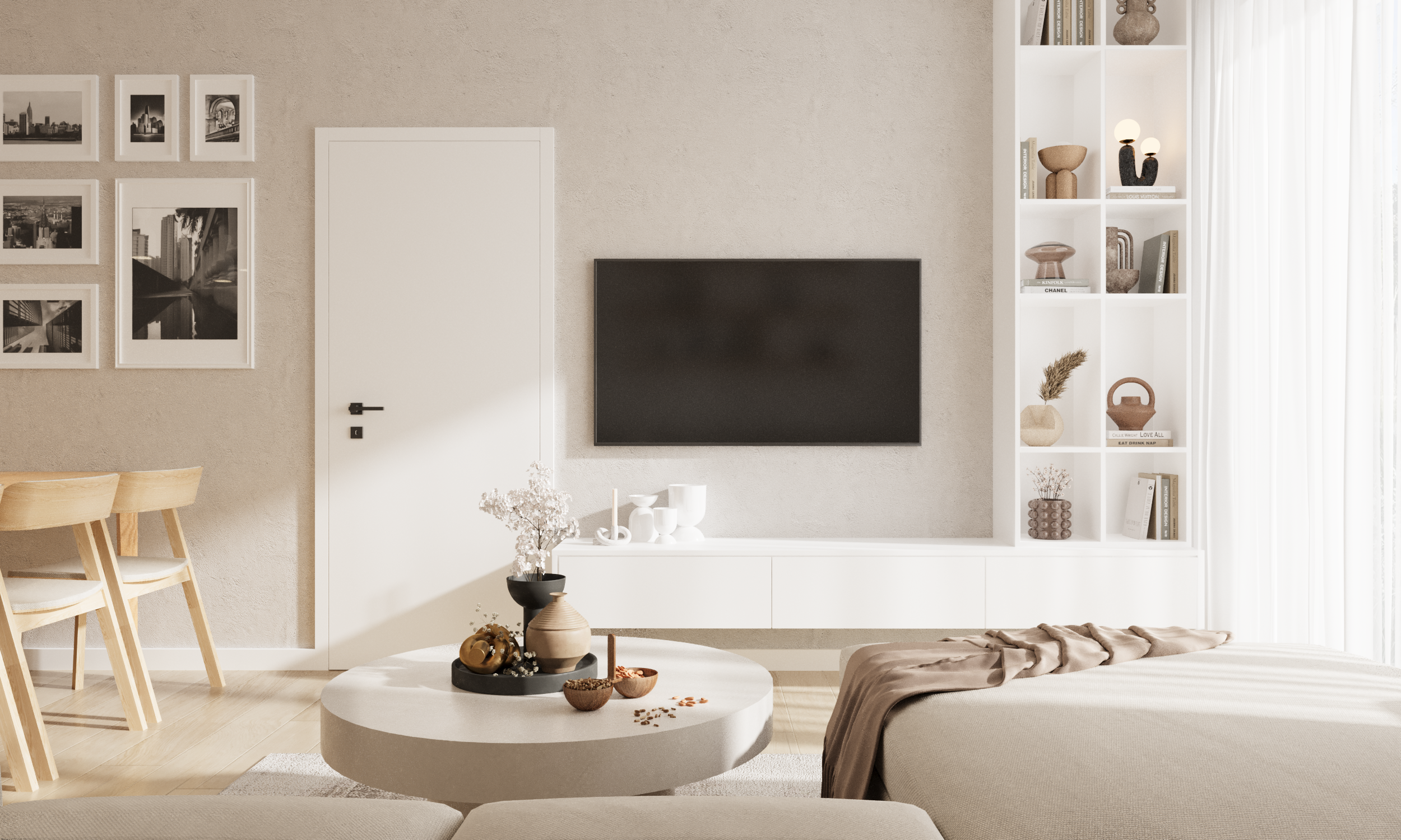 Besonders wichtig war es uns, dass der Raum nicht nur schön aussieht, sondern auch optimal nutzbar ist. Die Anordnung der Möbel und intelligente Stauraumlösungen sorgen dafür, dass jeder Quadratmeter bestmöglich genutzt wird. Minimalismus war dabei nicht nur eine ästhetische Entscheidung, sondern eine bewusste Wahl: Klare Formen und helle Farben schaffen eine ruhige, harmonische Atmosphäre – ein Ort, an dem man sich einfach wohlfühlt.