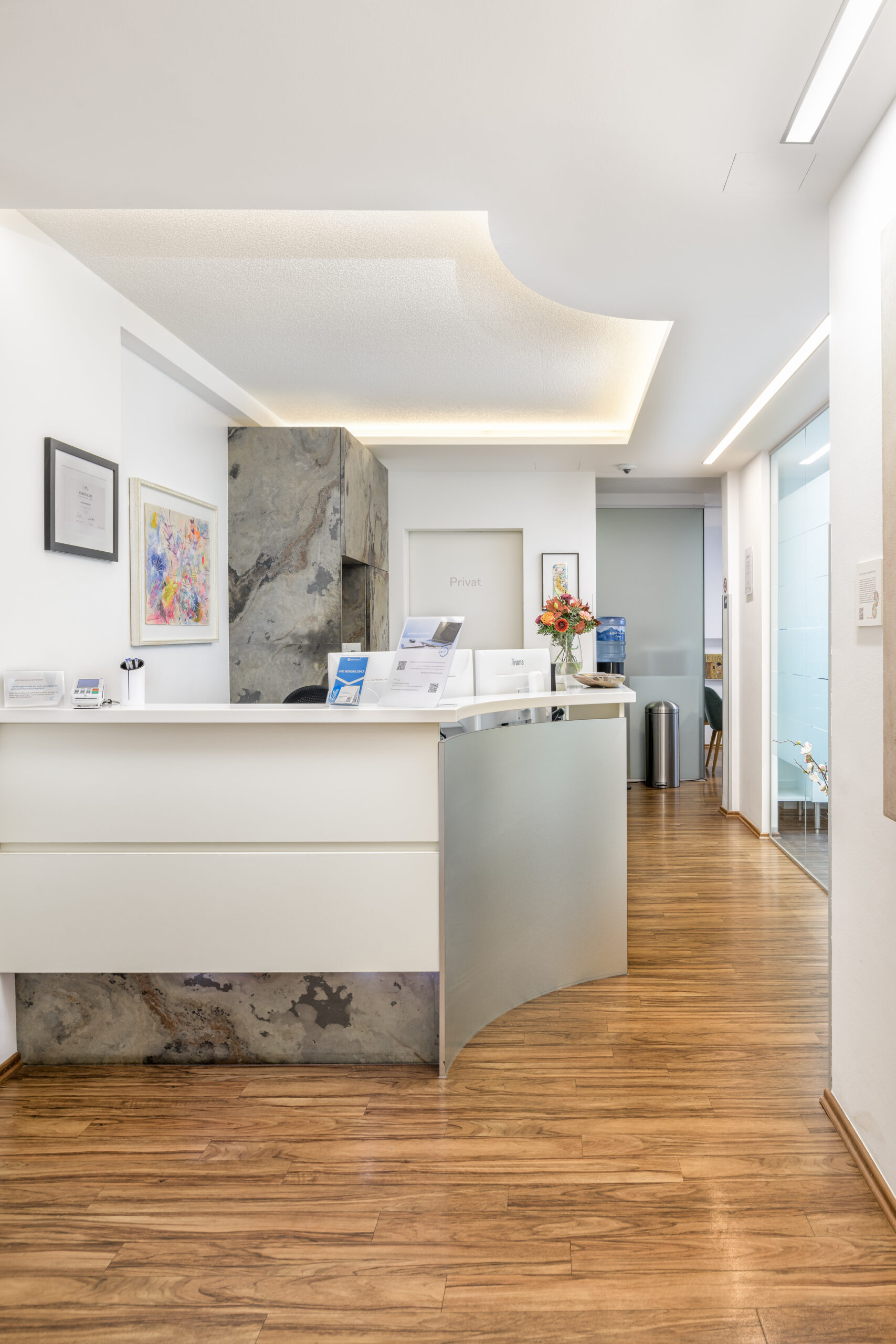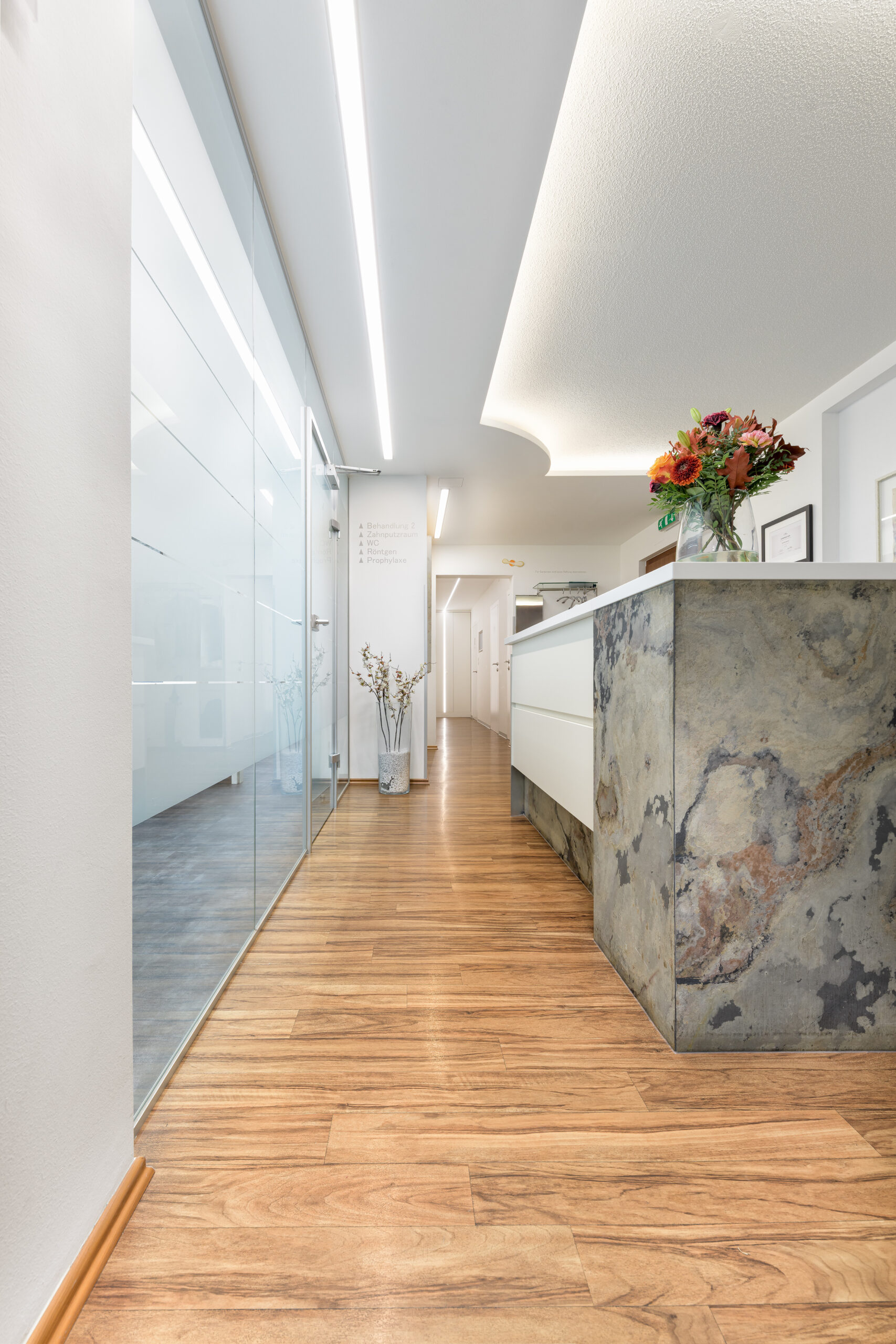 Ein Zahnarztpraxis Design mit Seele: reduziert, elegant und klar. Ein Ort, an dem Patienten Ruhe finden und das Team Inspiration.